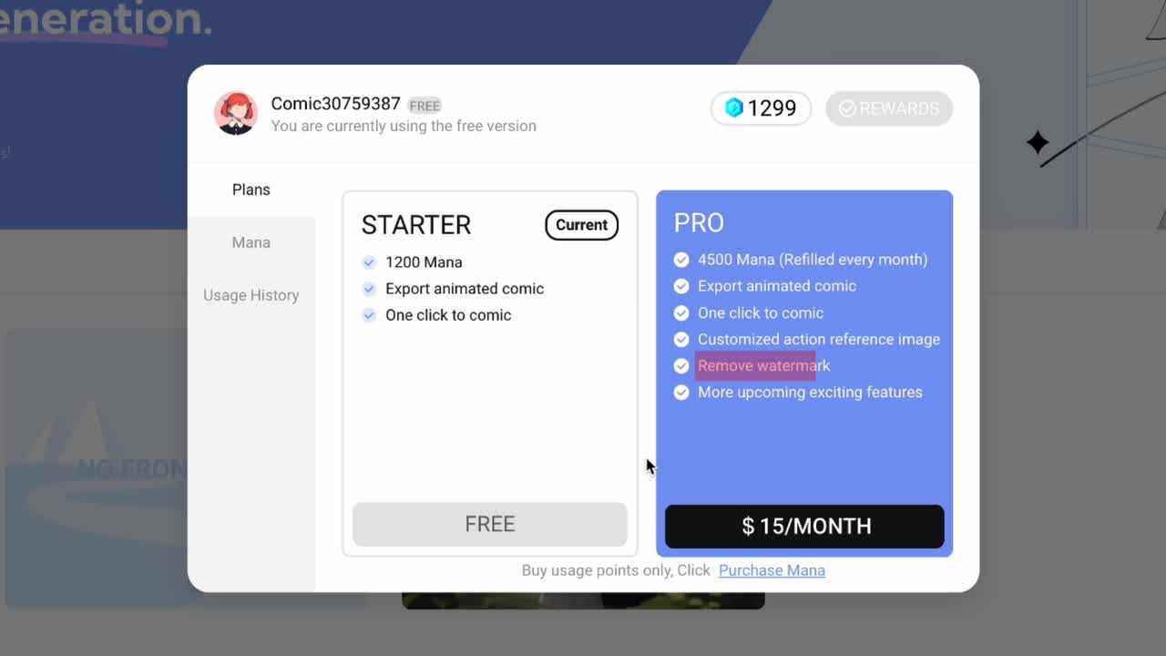 我试了几次,基本上生成一次只需要三个积分。所以啊大家如果只是试着玩玩绝对够用。当然如果你需要更多的生成次数,移除水印和更高级的操作的话,也可以每个月花十五美元买pro版本。接下来我们正式开始做漫画,整个过程一共有五步。