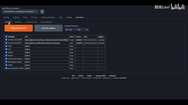 点击extensions插件,从u r l安装,输入animal tifft github仓库地址,点击安装。安装完成后,回到前面的已安装页面,点击确认并重启u i。现在我们能看到下方多了一个animates dif插件选项。下一步,在项目作者的hugging face主页下载动作模组。