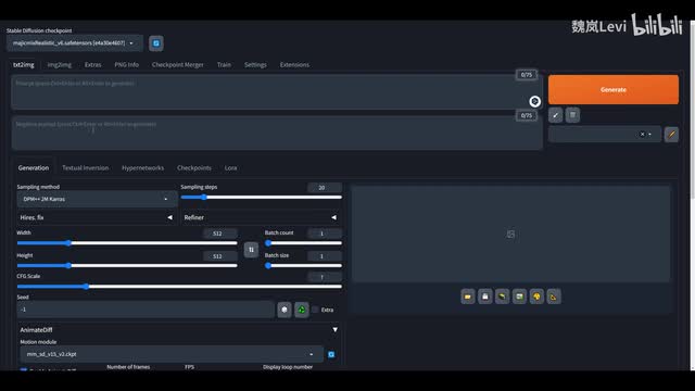 视频的后半段,我会介绍一种使用ai绘图工具stability fusion来生成视频的方法。使用的是一个叫animate diff的插件。类似于control net animate diff也是一个可用于sleep diffusion的插件。生成视频的原理是在基础的文本到图像模型中添加一个运动建模模块,这个模块通过网络上的各种视频和短片进行训练。