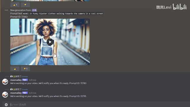 下面咱们来看一组效果对比,是我使用同样的提示词,分别用on valley和pga来生成的视频。moon valley的使用方法跟披萨一样,也是在他们的官方disco的服务器通过机器人指令生成视频。new belly机器人目前不支持私信,所以我们在左侧的new梦频道中任选一个加入,然后点击右上角的井号图标,创建一个新字区。在文本框输入斜杠,create空格。