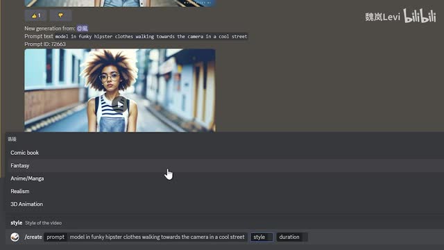 在prompt这一栏输入你想要生成视频的文字描述。在第二栏的style这里选择一种风格。目前有五种预设风格,分别是美漫、幻想、动画、写实和三d建模。第三栏的duration选择视频长度短中长,生成的视频时长分别是一秒、三秒和五秒,视频越长需要的等待时间也越长。