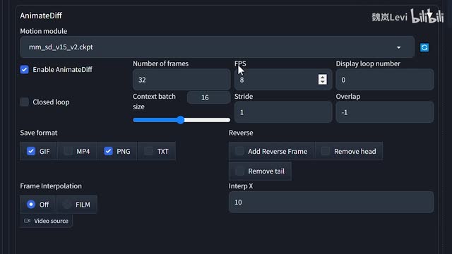 点开animal的diff插件。在动作模组这里选择我们刚刚下载的文件。勾选下方的enable animated diff,在number of frames和f p s这里填入对应的数值。例如总帧数三十二f p s八生成的视频时长就是四秒,总帧数三十二f p s十六时长就是两秒,以此类推。