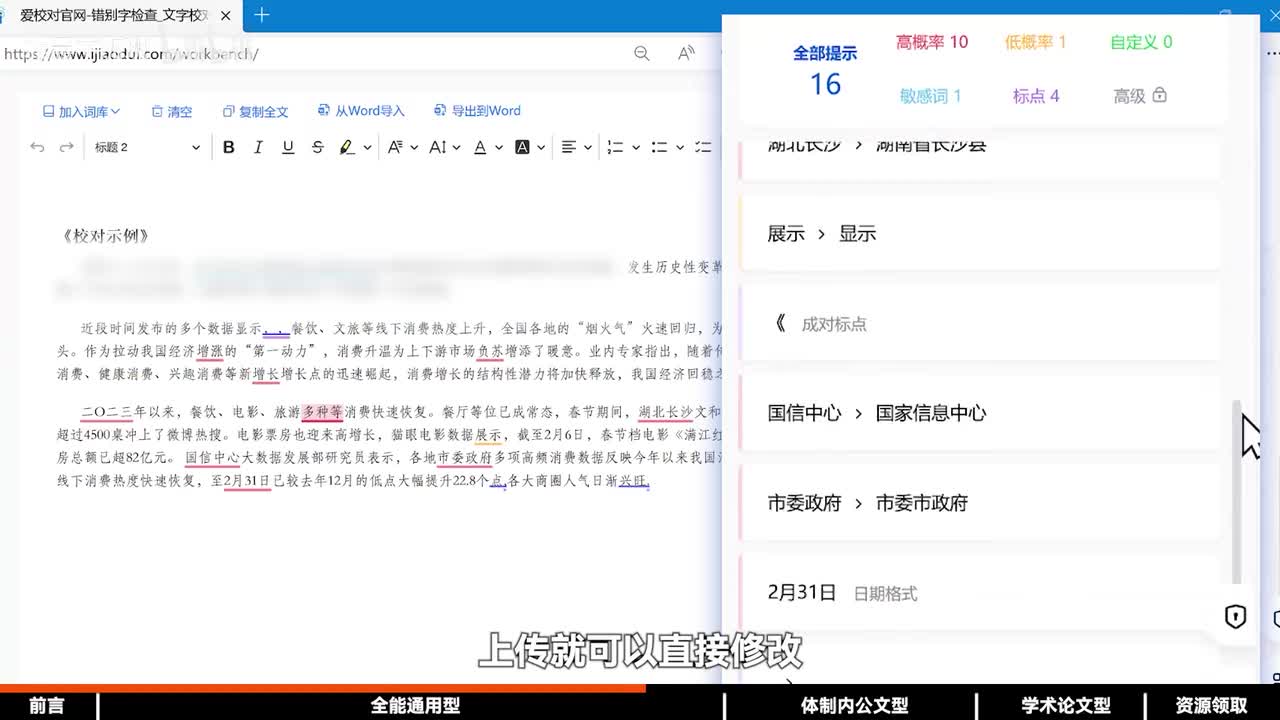 它呢就能够帮你生成一批对应的词汇,还可以用同样的方法来搜句子,用一些金句来给你的内容增加亮点。第二个解决细节校对错别字、译文词、敏感词上传就可以直接修改。还可以在word文档中甚至p p t中来一键校准文案内容,避免工作尴尬,提高汇报质量。总之,生活必备,还免费。