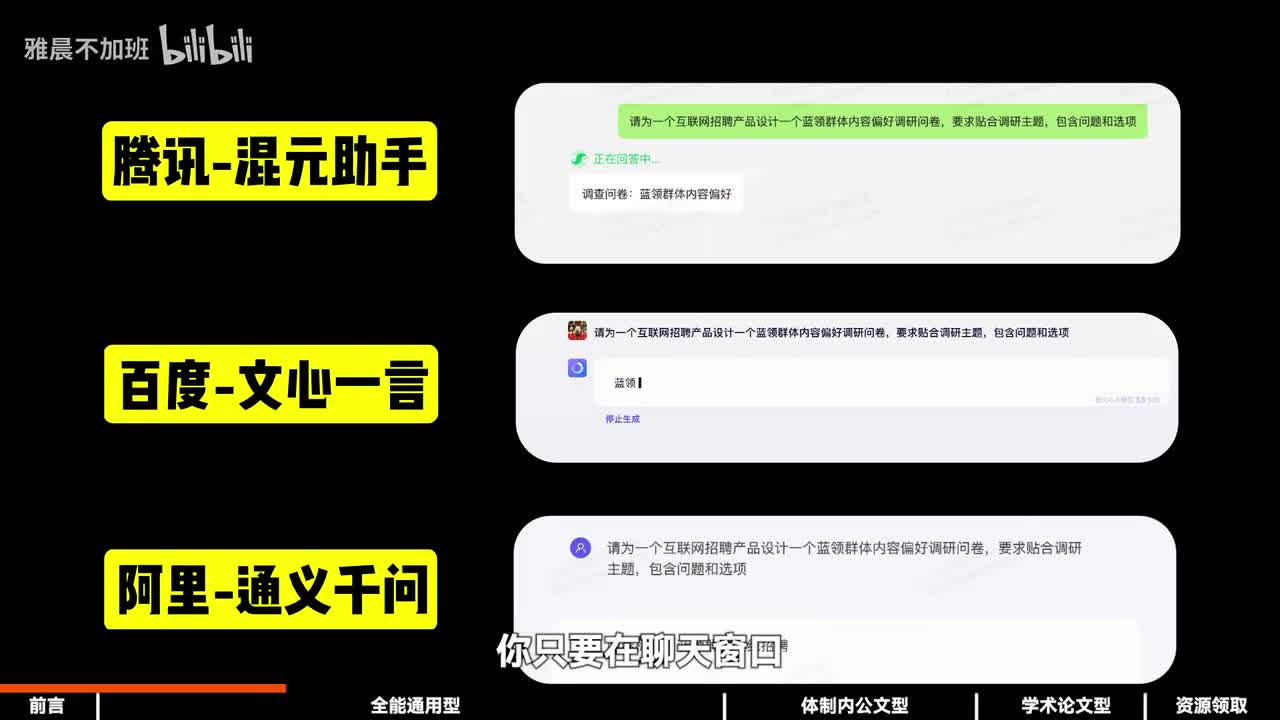 不过呢,特定的场景的ai写作工具,有时候总是满足不了领导莫名其妙的任务需求。但这三位在大厂上班经验丰富,很会写东西的大佬说,你只要在聊天窗口把领导的需求给他一描述,他们啊就会直。直接给你解答。在回答同样一个写作需求的时候呢,内容都差不多,制作初稿也都够用了。