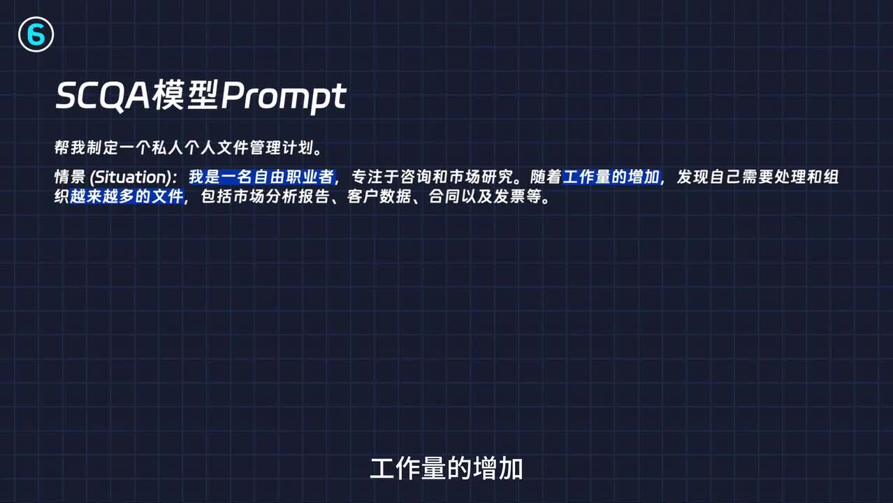 situation, 情境任务的背景是什么?complication冲突目标和现实的差距是什么,以及有什么已有的素材和信息。question疑问,当你要解决的问题是什么,或者要完成什么样的任务?answer回答,提供具体的解决方案。这次换个例子,制定一份个人文件管理计划,就怎么整理u盘内存文件等等。