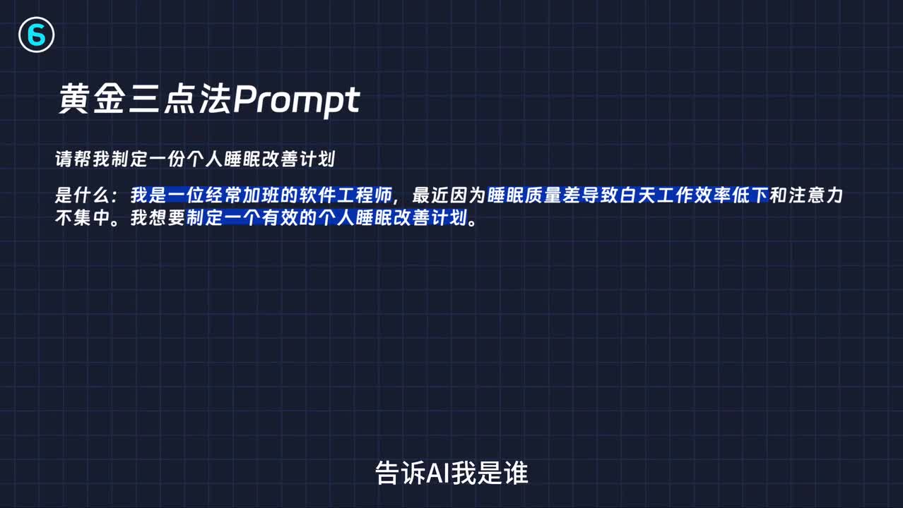 不能白嫖,只需要你支付一个点赞就能拿走,绝对超值。第三个技巧,黄金三点提问法,原话翻译是什么?为什么?怎么做?简单吧,不单写prompt这次制定一个个人睡眠改善计划,按照惯例看看a i滞胀的直接接案例,黄金三点提问法prompt这么写,制定一份睡眠改善计划是什么个a i我是谁?最近做的好差,工作效率计划要制定一个个人睡眠改善计划是什么?好了,我我能更好的活活活得更爽,怎么做?请问我应该制定制定这样一个计划,发给我一个,帮我制定了四周。计划从日常习惯改变、睡前准备、睡眠环境优化、睡眠跟踪等方面给出了详细的建议。