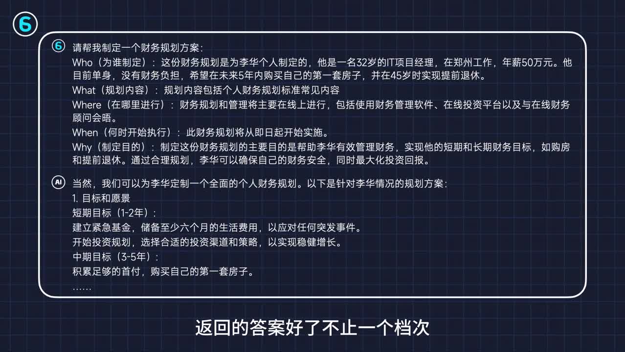 而五w结构恰好能够同时满足这四点要求。没错,就是那个你熟悉的五w w谁参与这件事?我这件事面向谁?where在哪里做?哇,具体是什么事儿?问什么时候做?why为什么要做?知道明确的指令之后,这次prom这么写,请帮我制定一个财务规划方案。这份财务规划是为李华个人制定的,说让他的个人信息内容,包括个人财务规划标准的常见内容,规划和管理将主要在线上进行,从即日起开始实施,目的是有效的关。