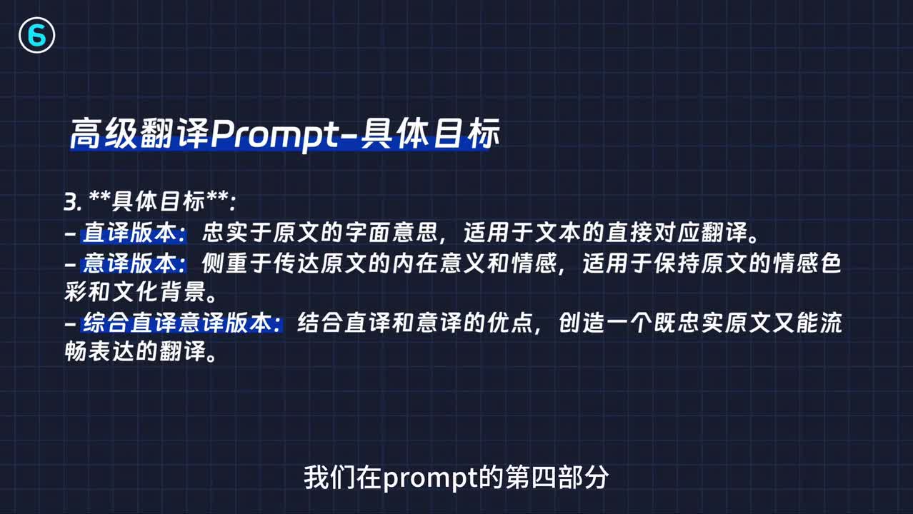 那现在我们给他具体的任务目标,也就是prompt第三部分写具体的目标,输出直译意义和综合版本。所以为了保证输出的要求,我们在prompt第四部分要做一些规范的版本。我们不是让他翻译个版本,那么我们要要求他他。记得标注每个版本。