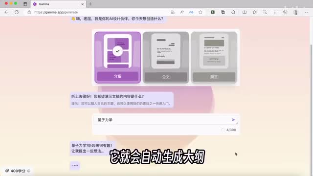 我们只需要根据提示选择我们需要生成的内容,然后输入本p p t的主题,它就会自动生。大纲,然后点击继续不到十秒,它就会自动生成一篇p p t。