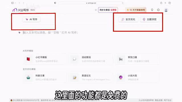 这里有个非常讨巧的方法给到大家,直接打开字节出的这个a i写作工具火山写作,这里面的功能都是免费的。因为背靠自己强大的自研大模型,出来的效果我觉得都可以直接拿来用了。