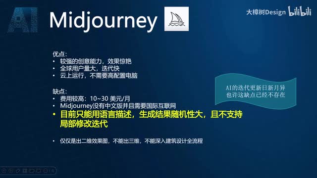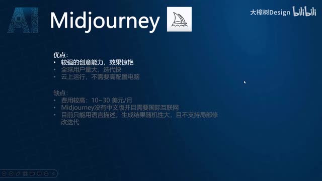 但是他要有严重的缺点,第一,费用非常高,每个月是几十美金。另外呢媒体精灵没有中文版,并且需要这个国际互联网,也就是需要魔法上网。当然最大的缺点还不是在前面自己花钱或者说沟通上面。它的最大的缺点,它只能用语言描述生成的结果随机性大,且不支持局部的修改和迭代。也就是说。