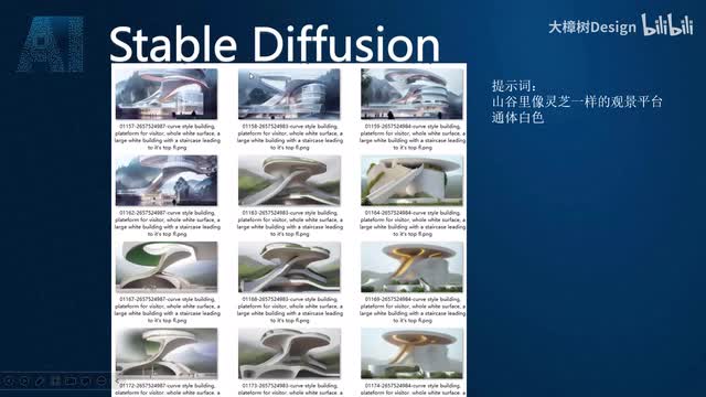 同样的,我们也是用提示词来创造。中文的一个观景平台,在优美的山谷顶端,这个平台是曲线的,通体白色的,抽象的像灵芝一样的。于是呢他就创造了以下四个,你可以一批一批的创造很多批,创造更多的方案。国外的也有一些,比如说阿克a i develop a i。还有国内的建筑学长。