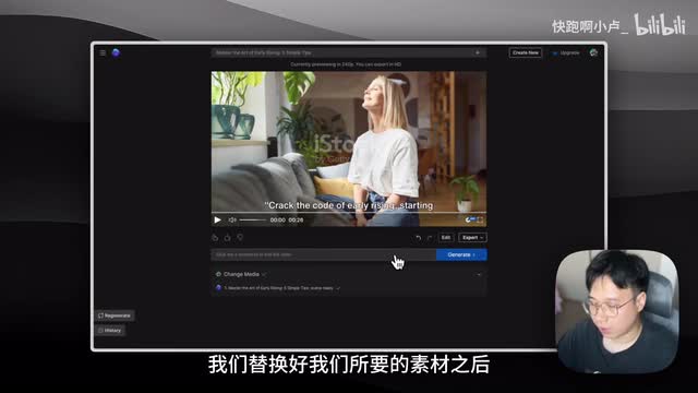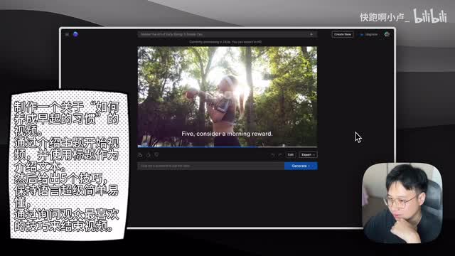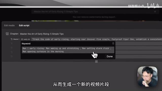 好了,大概一分钟左右,ai生成的视频就做好了,我们一起来预览一下效果。 不仅如此,我们可以点击这个编辑按钮,可以对这个视频进行一个计时编辑。我们可以看到上面有很多我们的一些视频片段,随机点击一个就是开一开始开头的那一个起床那个片段。