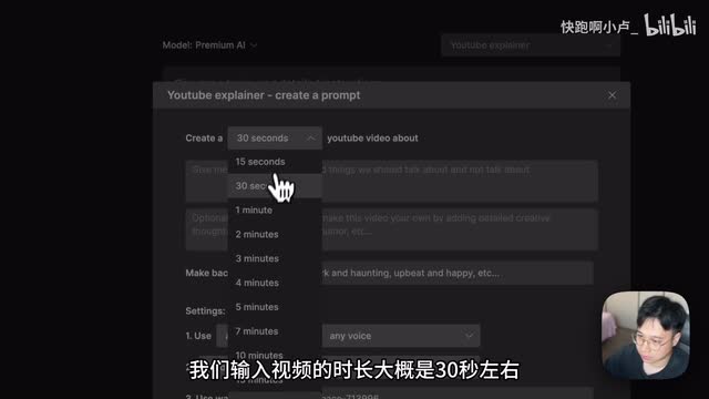 我们可以直接输入提示词,或者根据它的一些预设来生成提示词。我们选择预设解说员,我们输入视频的时长大概是三十秒左右,让我们再输入我们刚刚准备好的内容。下面选择性别,还有音色。