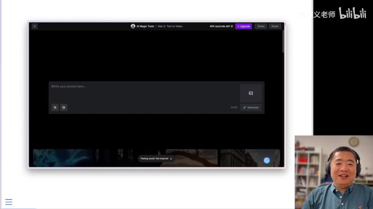 我一看赶紧就点击这个里面的蓝色按钮啊,开始尝试。哎,进到他的页面里也是非常的简洁,进来之后你就可以在这里输入提示词,然后他就给你生成视频。哎,这里是一些他。