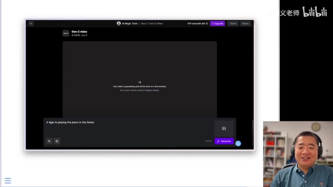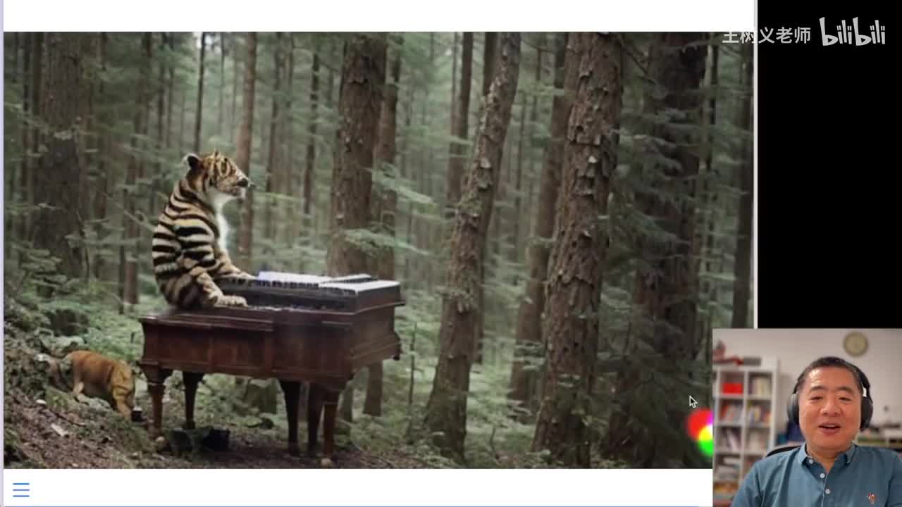 那下面我再试一个,这个时候我写的提示词呢是一只老虎正在森林里弹钢琴,哎,那么生成的效果呢大概是这个样子。哎,我觉得哎这个还确实是挺好啊。这个老虎的这个动感,尤其是它那条尾巴啊,我觉得动的还是挺有意思。