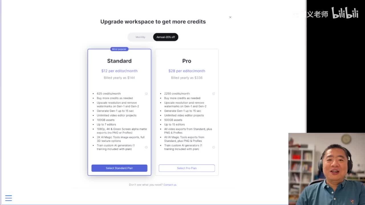 它现在的标准版啊是十二美金一个月,那么它的专业版呢是二十八美金一个月。如果你确实有这方面的需求,我觉得哎可能这个比较适合你。但对于我来说,现阶段就是拿它来做一些短小的视频,我也不担心它的清晰度和它的水印。
