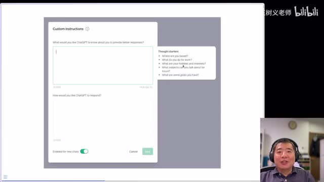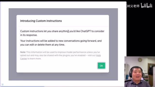 除非选择退出,否则这些信息将用于改进模型性能,并且还可能与您使用的插件共享。哎,请访问帮助中心,这个咱们一会儿再说。我们先来看看他的界面啊,这里是你设定的方式。首先先要告诉他啊,这个你想让他知道些什么啊,例如说哎是你你在哪儿啊,对吧?你做什么工作呀,你有什么兴趣爱好啊啊然后呢哎这个你喜欢讨论什么样的主题,以及呢你有什么样的目标,这些是放在这儿了。那么下面还有你希望他如何进行回应。哎,这里说你是希望我呃回答的更加的呃严肃一点啊,正式一点啊,还是说希望回答的轻松随意对吧?以及呢你希望这个呃回答的长短是。