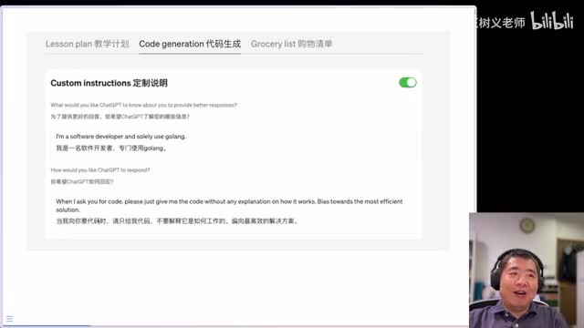 哎输出的默认一律是开放啊可。python现在是多么的热,多么的受到喜爱啊。就是你默认我只要不提一律用python来输出。但人家是个go on的程序员,所以对他来说python输出的内容不是他想要的。现在他的一遍一遍的显示指令现在不用了,只要他把这样的一个custom instructions开启,那么后面所有的方法都是用go lang的形式。那下面我们来看看啊怎么在你自己的chat g p t里面进行设置。