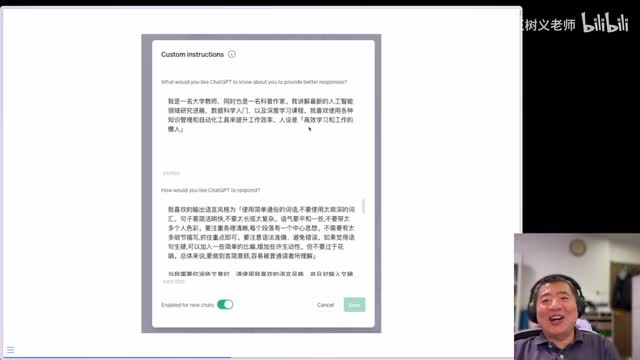 怎么样子在这里面chat g p t的回答究竟是不是应该保持中立,还是说应该有一些倾向性等等等等。那么这是我填的自己的这样的一些这个指令啊,我把自己的工作啊,还有这个平时做的一些事情,现在都告诉他。我教的课程啊,哎我的人设啊我的人设是高效学习和工作的懒人啊,写完这句话我觉得脸皮现在越来越厚了啊。呃然后呢下面是一些我对chat g p t输出的要求,这个我们下面会讲。你看现在我写了多少字儿啊,实际上这里面最大是一千五百个字啊,我写了一千零六十三。写完之后我都吓一跳,这就证明了现在我对他的这样的输出的定制已经做了很多详细的要求。