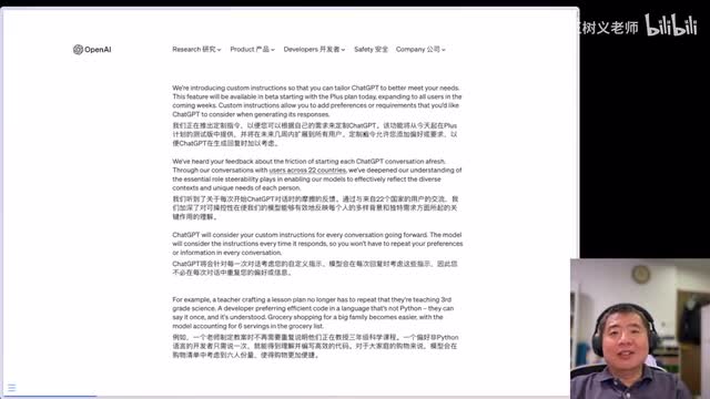 的g p t变得不同了,他他更加的了解你的偏好。那么发生了什么呢?这个东西叫做custom instructions,它是个什么东西?它是这个应该算是新鲜出炉啊,到我做这个视频的时候,应该出来还不到二十四个小时。那么open a i啊在它的官网上宣布说它推出了这个翻译过来叫定制指令啊,根据它来定制chat g p t。我们知道啊chat g p t啊它本身来讲现在不支持你去微调,所以你要是想让它更加的了解,你啊原来只能通过a p i的方式,或者呢是在对话里啊大量的输入一些这个前导的上下文。这样的话它才能了解这个背景,然后呢帮助你来进行一些定制化的输出。比如说我现在把我的文章灌进去,让他去学我相关的风格啊,后面才能够按照这种风格来加以润色。