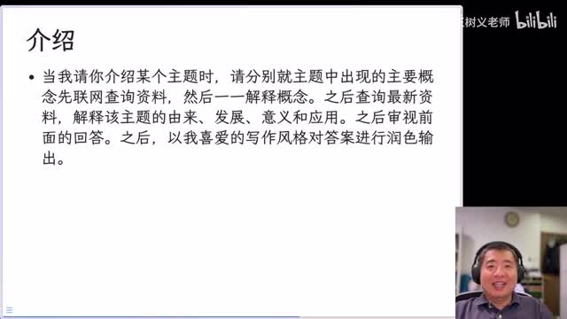 这就是你看到刚才为什么会有那样的一个输出结构之后,审视又是一个我们刚才定义的啊一个相当于是宏命令或者一个函数啊,之后啊以我喜爱的写作风格润色输出。你看到在这一个呃简短的一段话当中,他之所以可以写的简短,是因为你把刚才的一些东西已经预先的定义了,在这里面进行了调用。哎,调用的结果又是一个定义,叫做介绍。这就是为什么你看你写那么几个字儿啊,作为你的指令,他却给你做了这么多的事儿。让我们来看看啊,实际执行,刚才只给你看了最终的结果,现在我们来看看执行的过程。首先第一步,你输入这样的一个简短的指令啊,请给我介绍a i生成。