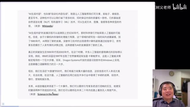 但是你看看他给我写了多少东西,写了这些东西之后,我在后面加了一句,我说这个请继续,因为刚才那一屏没显示下来,这是最终的结果。这里头哎我让他给我上诉到了很多的历史,那你说你也没在。提示词里写啊你要上诉什么历史啊这些东西对吧?然后还有将来未来的这种展望啊,更有意思的是哎,我们来把它放大一点,你看的更加清楚啊,这个是吧?来源来源的链接这个来源的链接也就是现在给你展示的这个内容,不仅啊它它使用的内容是更为新的准确的,而且你能够追踪到它的原始链接,它的这样的一个布局啊,包括我们一上来先解释概念,然后我想让他给我交代历史之后啊,说明它现在的应用啊以及未来的这个展望,这些东西都在这里。当然了,这只是一个例子啊,我是这么定的。你可以让他以其他的方式,以你感兴趣的这样的一个组织形式来输出。哎,这就是现在我们看到同样的提示词加了一点小改动之后。