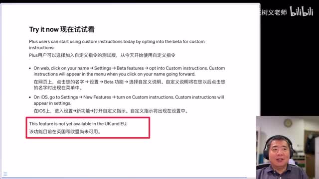 那么这里还说到啊这个隐私的问题,对吧?哎,可以通过数据控制来禁用一些这个通过你的数据去改进它的。模型这样的一些工作。哎,那么这里头呢他还说如果我们用你的数据也会删除其中的个人标识。但是我觉得我们还是更加审慎一些为好,为什么呢?因为下面这一页你会注意到,在这里头他特意提到该功能现在在英国和欧盟尚未可用。为什么?我们都知道欧盟有一个g d p r是一个非常的高标准严要求的隐私保护设定,就是open i现在的做法可能与这些要求现在还之间有一些冲突。哎,因此我也建议大家更加注重一下,哎,在你填写这些内容的时候隐私的保护。