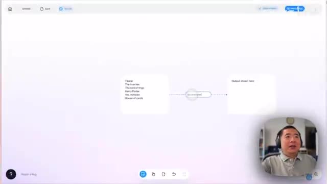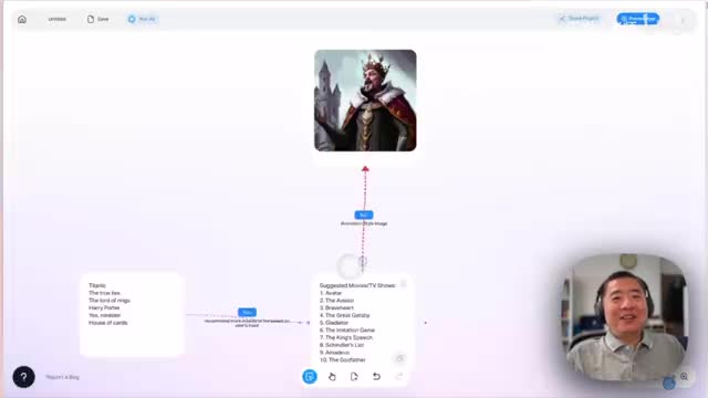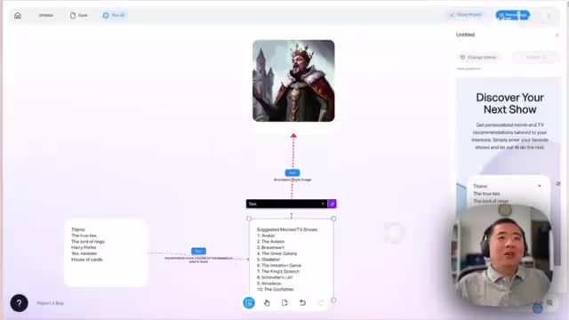 那么这个时候我们可以看到啊,它就会哎把一些东西加入进来。首先他把输入放在这儿,说这个是个输入框,用户将来在这里去输入一系列的内容,我们觉得可以啊,但是这光是这个显然不够,对吧?所以我们还得加一些东西,我们可以把这些加进去。我们点击一下这个绿色的按钮,然后你看这里就出现了一系列的就是add to add,那我们就把这俩都加进去啊,这是输出的推荐的影视作品加进去。然后还有我们要生成一张图,我们哎也把它加进去好了。