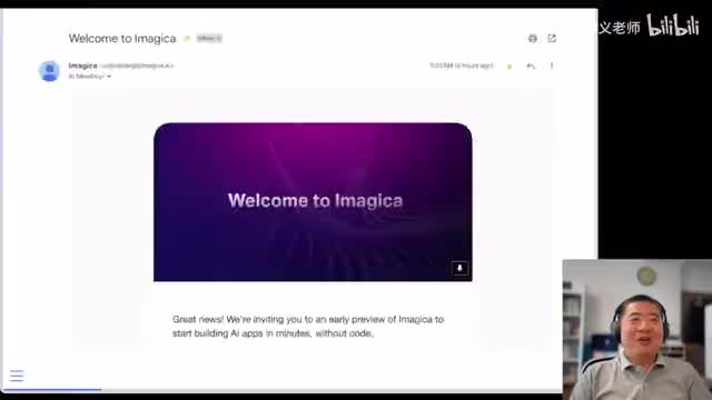 今天咱们来介绍的题目叫做如何不写代码创作a i web应用啊,听起来好像是有点天方夜谭的感觉,咱们来看一看。呃,首先呢这个又排到一个队啊,这个最近好像总在排队,排队的结果呢是告诉我,哎,呃这个欢迎你使用啊,这叫imaging啊。然后我就纳闷啊,我说什么时候排的这个队,对吧?现在这个队排的太多,有的时候我都忘了,然后呢我就去收件箱里面去翻,结果还是翻出来了啊。呃这个on the weight list,就是这时候是你排上队了。