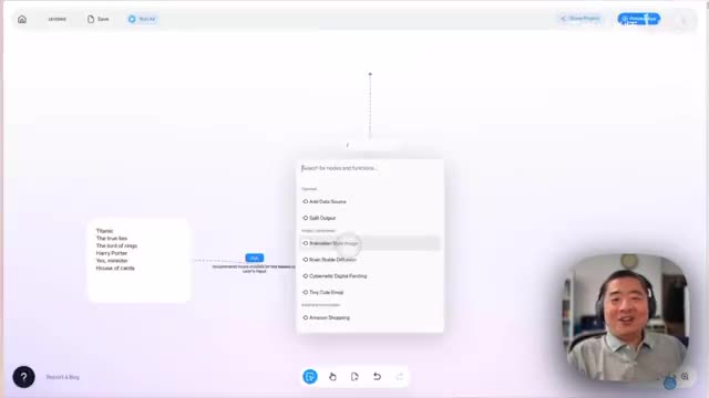 哎,这里你看它有一系列内置命令啊,包括去这个加数据的来源啊,然后这里有这个哎对输出进行这个分割啊,我们来这个animation style image就是一个动画效果的图。推荐影视作品如果能以这样的一个呃这样的这个动画式的图哎放在这里,让人感觉会非常的有趣,对吧?所以我们把它就给它压上压上。哎,然后看看他给我们生成一张什么样的图啊,这里正在一个生成的过程啊,正在生成。然后再给我们生成什么?哎。