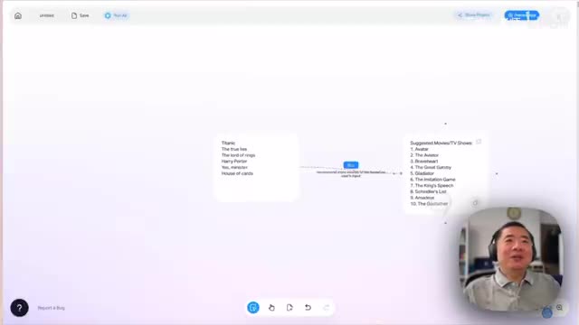 这个你看那是不是将来就静态的把这些东西演示出来。当然不是,所有东西都是根据用户的输入加上a i的这个处理,最后给我们显示一个结果,我们现在可以说这可以了。可以之后我们就可以publish,就是这个我们可以发布了啊。这一下子你的这个应用,这个影视推荐引擎啊,对于我来说就是我刚做的影视推荐引擎就可以用了啊,这里有一个链接啊,有个链接你可以考下来。