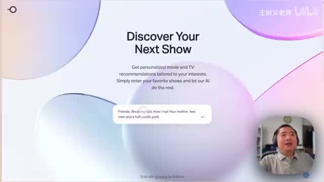 这个我先把它哎已经考下来了,然后现在呢我们让他干一件事,在这里直接的给我打开。哎,你看这就是他给我们嗯做出来的这个app啊,这里很有意思,他实际上直接把我们这个是干什么的都已经说出来了啊,这discovery next show就是哎来找到你喜欢看的下一步的这个呃作品。然后告诉你,这是我能给你提供个性化的啊影视作品的推荐啊,然后是根据你的这样的一些这个喜好啊,然后来推荐。我在这里写几个吧,比如说我们加入friends这样,然后呢breaking bad。