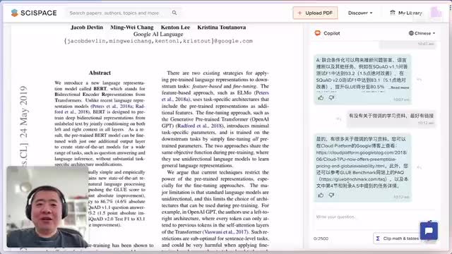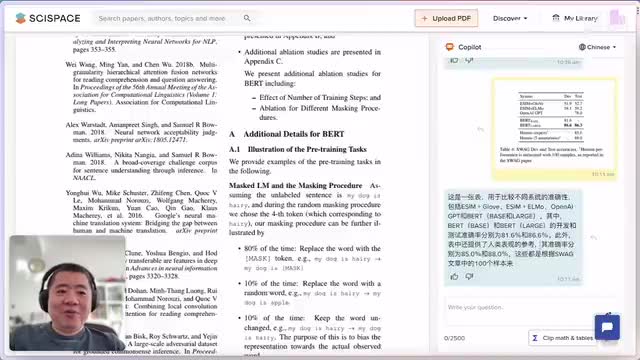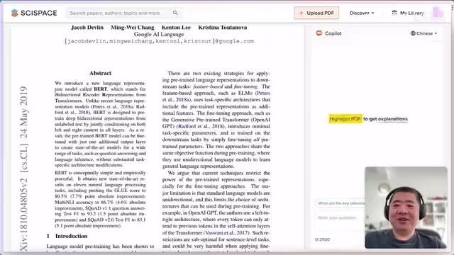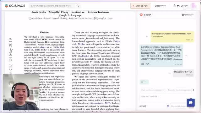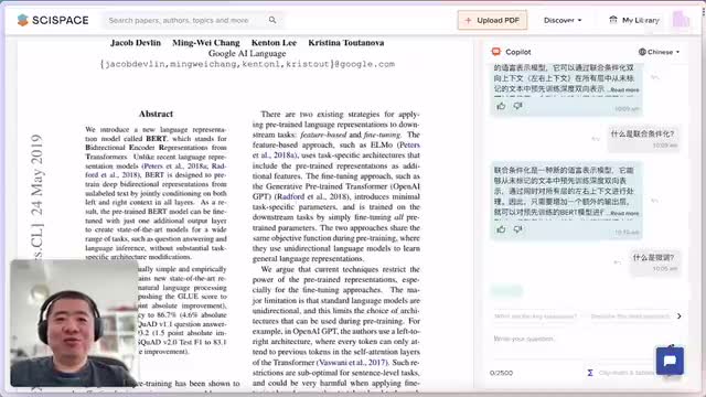 注意我们在这儿需要把我们的语言选择一下,默认是英文,我们这里选择的是中文啊,这样的话才有利于它用中文来和我们交互。好比说我们在这儿看到了一个词儿啊,by directional encoder representation from transformers啊,就是这个bird吧,我们把这个给它高亮一下,然后这里面就出现了右侧啊,我把我这个头像往这。而挪一下,哎,这里就出现了它的这个对应的解释啊。注意这个是用中文来给你去解释这些东西的,呃,你可以去进行追问。