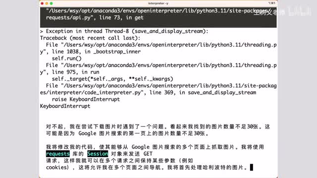 因为我们现在你说干什么事能离开网络,所以一旦你没有这个功能的话,许多的这个我们的一些设想都没法在这样的一个模式当中充分发挥chat g p t,尤其是g p t四它的这种啊强大功能。嗯,所以说这个是一个很让人遗憾的事儿。那么例如说在这里我就给你举个例子啊,假如说我们让他给我去下载一些这个内容,他直接就告诉我说我们我无法啊直接访问互联网来下载图片。哎,所以呢但是我可以指导你自己如何操作啊,这我用你啊,对吧?我自己会啊,再再说了,我不会我也用不着一个机器来指导我去做这些基础的枯燥的活,对吧?那么这里给你介绍一个概念叫做open interpreter啊,这就是我说的这个新玩具,它是一个这个开源的项目啊啊这个你可以看看他那个星数的增长的这个速度啊。嗯,他自称啊是这个开源版的code interpreter啊,这个而且更强。