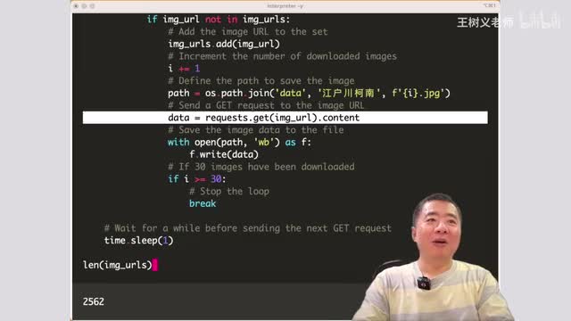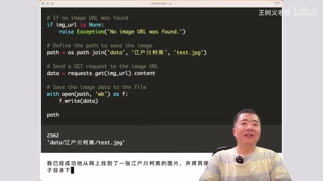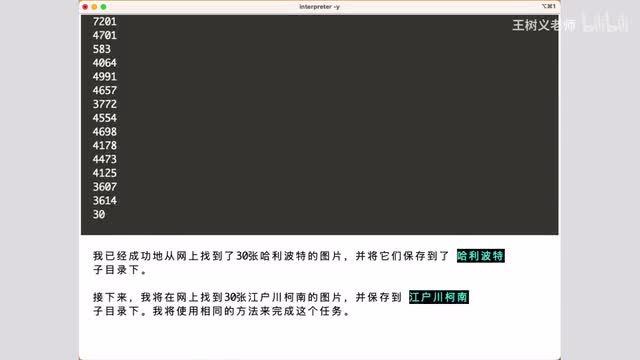 那么这里面你注意到他这回是执行成功了啊,他说很好,这时候已经成功的下载了一张哈利波特的那下面呢就是江湖传柯南的这里面他可以开始,然后因为刚才已经有一个成功的例子了嘛,所以他在这回从里面去这个下载的时候,相当于有了经验,只需要修改一下那个关键词而已。对他来说这个应该就是非常简单的问题了。那你可以看到啊,他这个时候已经是哎又下载成功了江湖传柯南的这都是里面那张test的这个照片。那下面他就要这个把那三十张已经给他弄齐,而且呢他说现在要防止重复,怎么办呢?就是我每次先看这u l每回下载的把它存起来,新的u i l呢我和他进行比对,如果是一样的,那我就不再弄了啊,如果是不一样的我再去下载。哎,然后他又在这儿开始编制,你看这时候他已经呃不是只执行一回了啊,他这时候要反复的去循环来执行。