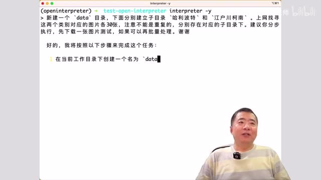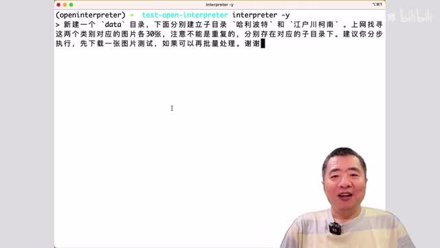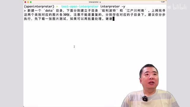 在这一篇里面我们提到了当时用的一些数据,例如说有这个哆啦a梦和瓦砾啊,让他各下载了一些这个图片,当时啊这个手动下载。啊,刀耕火种是我自己干的啊,现在我希望什么呢?让open interpret ter替我们做啊,千万不要让我在自己动手了啊,你来啊,那他做的怎么样呢?下面我来给你实际的演示一下,我们来看看现在的这个提示语。这里说呢首先新建一个data目录,下面分别建立子目录,一个是哈利波特,一个是江湖川柯南啊,上网找寻这两个类别对应的图片各三十张。这里有一条啊,注意不能是重复的,因为什么呢?我们都知道这网上的照片啊和图片有很多。是重的,我能与这个重复的显然无异于后面我们去做这样的一个训练,对吧?然后呢告诉他分别存在对应的子目录下,哎,建议你啊分步执行。