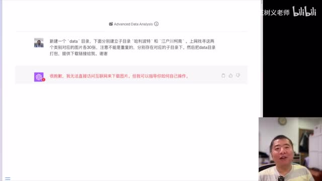 那么我们来举一个例子啊,这个例子呢就是刚才说的想让code interpreter啊啊或者现在叫高级数据分析模式做的这样的一个图片数据的下载。有的人可能不知道为什么这个你你要批量下载一堆图片呢?实际上是这样,机器学习里经常有这样的需求。我们构建一个模型,让它帮助我们去区分不同种类的图片,这个来讲是一个常见的任务。可是这里面去网上数据的图片,这个实际上是一个非常辛苦的活。那么我在之前,这应该还是在好几年前了啊,当时我介绍如何用python和fast ai做这个图像的深度迁移学习。