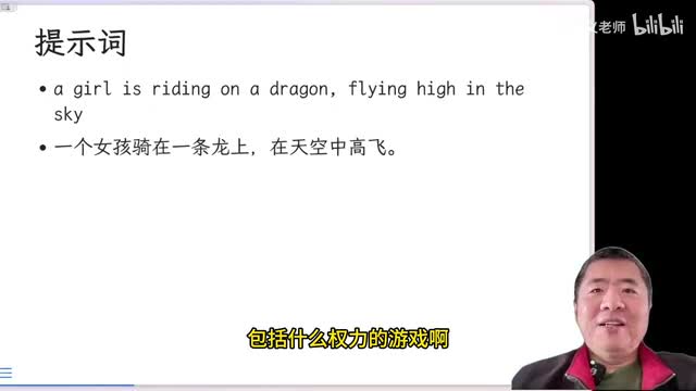 这第一个提示词呢是说,哎,这这是英文啊,她当时还只能认得英文。我给你翻译一下,就是一个女孩骑在一条龙上,在天空中高飞,我脑袋里面想的那个图景啊,包括什么权力的游戏啊、龙之家族啊,里面这种潇洒的那个女战士那那一类的啊。哎,然后他需要创作一段时间,你看这是到百分之三十九的时候啊,然后他最后给我创作出来了一段很短的视频,我们来看一看。