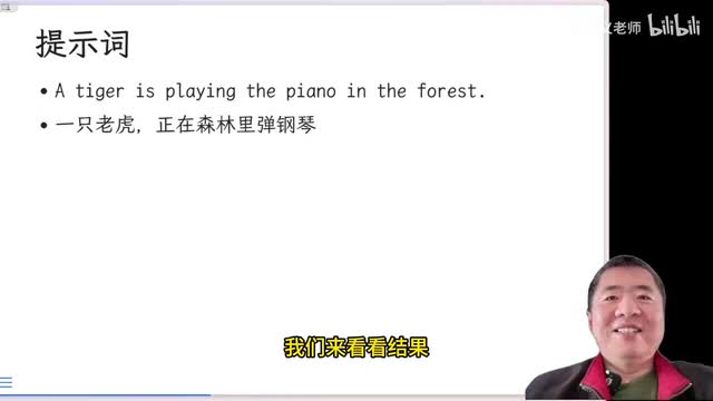 后来我又试了另一个这个提示词,呃,这个的提示词呢是一只老虎正在森林里弹钢琴。我们来看看结果。哎,你看我觉得吧哎这一段倒是更有点意思,对吧?老虎也有,钢琴也有啊,挺好。
