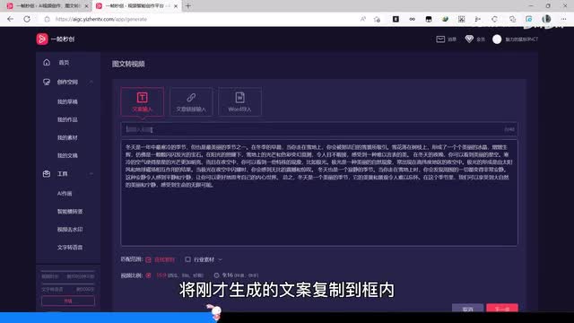 生成文案后可一键生成视频。选择图文转视频,它支持文章、链接、web三种模式。这里演示文章生成视频模式,将刚才生成的文案复制到框内。输入标题,点击下一步,系统会对文案进行分析,选择好视频类型,单击下一步,你的工作基本就完成了。