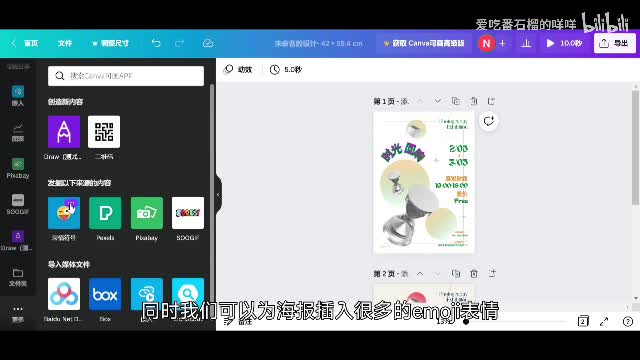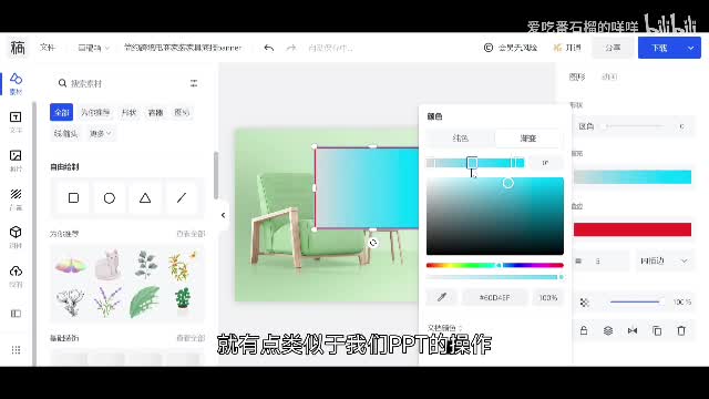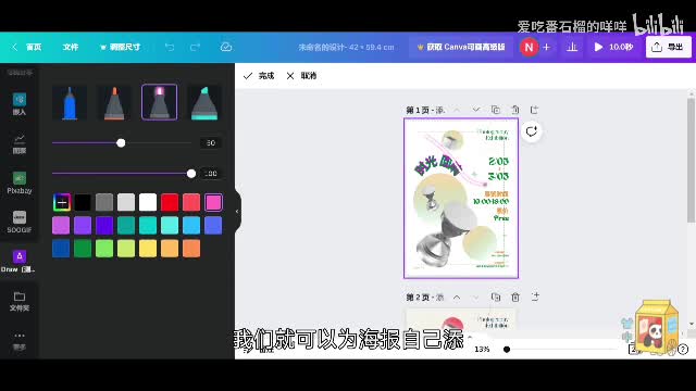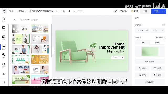 我们看一下右边功能区,它这边点击编辑就可以。自动调整画布大小。然后其实这几个软件的功能都大同小异。所以我只就只介绍一些亮点功能,其他功能是都其他功能都是它的使用方法上都是差不多的。呃,搞定设计的亮点功能,就是它的素材这边你可以自由绘制图形。