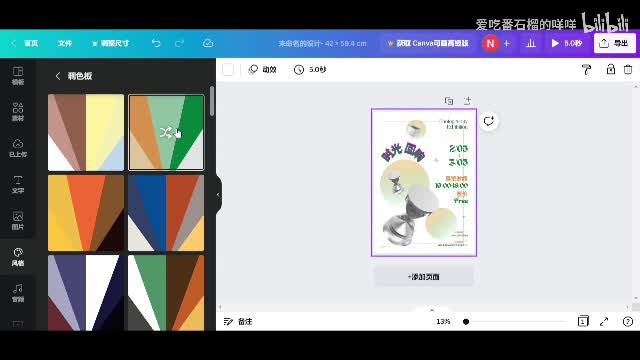 接下来就是一个我认为很有用的功能,点击左边的风格。点击调色板查看更多,任意点击一个你想要的调色的风格。它就会自动生成一个配色方案,你的海报也都会全都自动换色。我们也可以点击复制页面。然后在下一张页面换一个别的颜色效果,最终选择一个选择一个你最喜欢的效果进行保留。