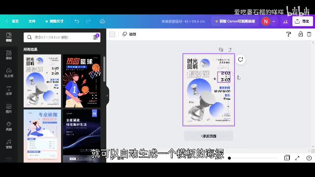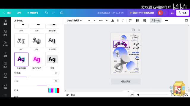 我们先来看一下左边功能区的使用,点击模板,再点击右上角的筛选条件。随意点击一个我们想要的模板颜色就可以应用筛选条件。就可以自动生成一个模板的海报。点击模板中的文字,再点击上方的更多按钮,可以为文字增加特效和动效。点击文字特效,这边就是可供选择的文字特效。