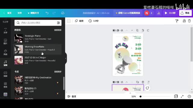 接下来就是音频。非会员只有纯音乐是可以免费插入的。我们可以添加一下纯音乐,看一下效果。点击一下,它就会自动插入。点击delete就可以删除。