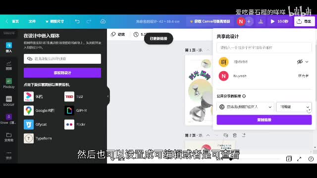 然后在最终完成海报之后,我们点击文件,点击保存,它就保存到系统里面。然后最后点击上方的这个加号按钮,你就可以将海报分享给你的朋友或者是团队成员。然后也可以设置成可编辑,或者是可查看,或者是只能发表评论的状态。然后复制到链接并发给他他就可以点击一下就进入到页面帮助您修改。然后这就是kaby可画的一些亮点功能的介绍。