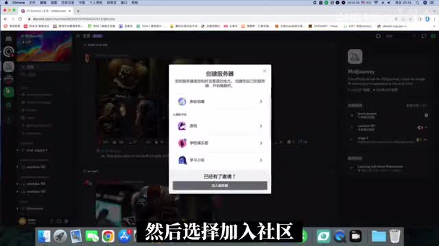 特色社区的第一个就是made journey。我们搜索mada journey,然后选择加入社区,然后点击网页左侧添加服务器,创建属于自己的服务器。
