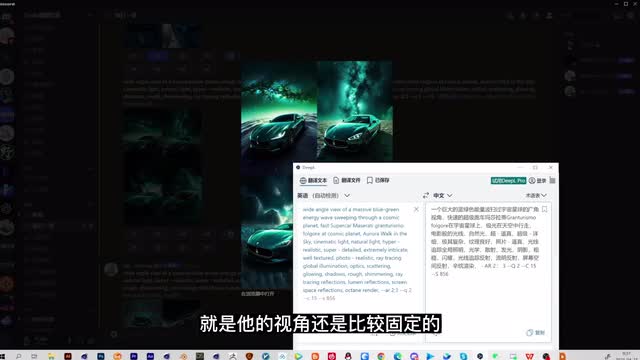 其实它就是比如说在一个什么样的,呃,比如说蓝绿色,我这个是给了蓝绿色,然后是给了一个宇宙星球的一个背景,然后广角是固定的,都是一个广角的视角,就是它的视角还是不要固定的,然后可以指定它。比如说是快速的,然后是一个什么样的车,你这个车可以改一下。后面的话基本都是固定的,就是用一些摄影类的词啊之类的,把它嗯固定在这。