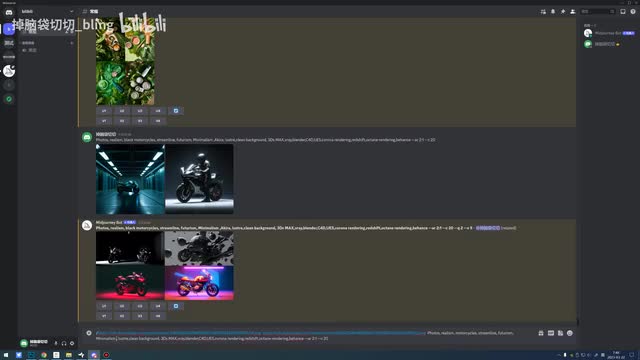 然后极简主义,我希望它简约线条感,然后有未来感、科技感,你可以加上科幻对吧?那我这里加了阿基拉啊,就是直接把这个名字打上去了,那它一定会有一个参考对吧?它是红色的那种机车。啊,然后这个光泽,因为摩托车它有车漆嘛,所以我这里输入了一个光泽,就你也可以输入一些光泽材质啊等等等等。然后干净的背景。因为我不希望它背景太复杂,然后后边就是一些废词是吧?前面是描述词、词形、形容词,后面就是什么三d max,什么v i blender、u一五、科罗娜等等等等。啊,你像科罗娜,我也是之前很少输入,但是它毕竟是比较偏写实的渲染器,所以我就输了啊,虽然说用处不大。然后最后加个behind,然后尺寸二比一c二十。那我们来试一下。