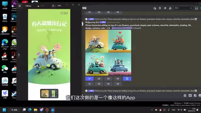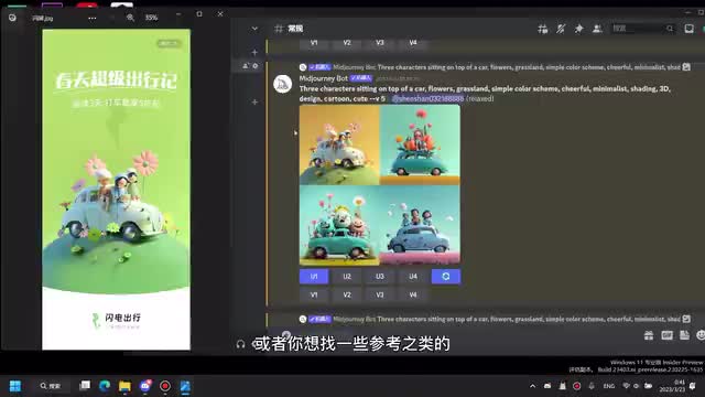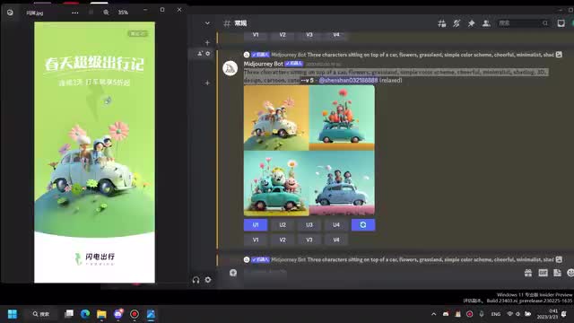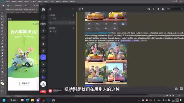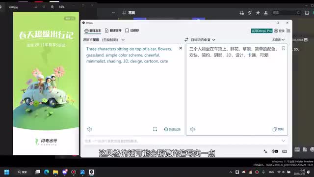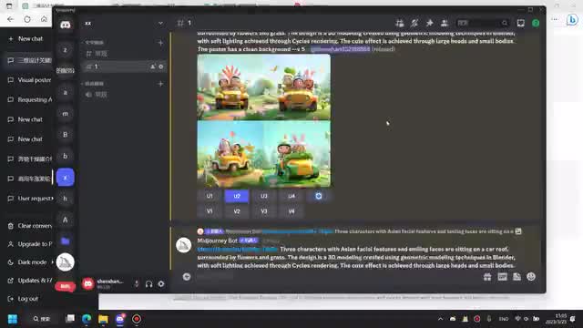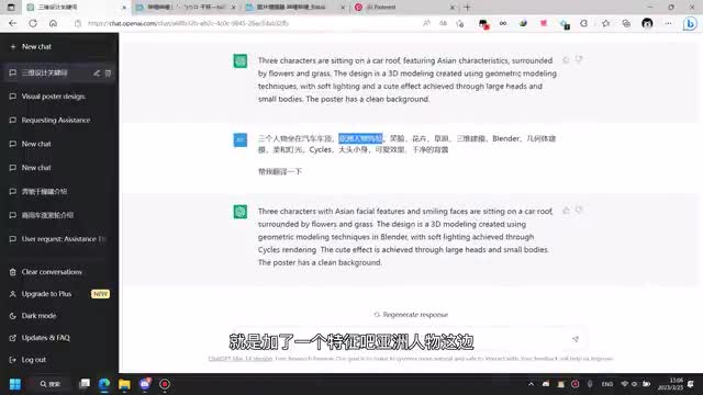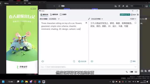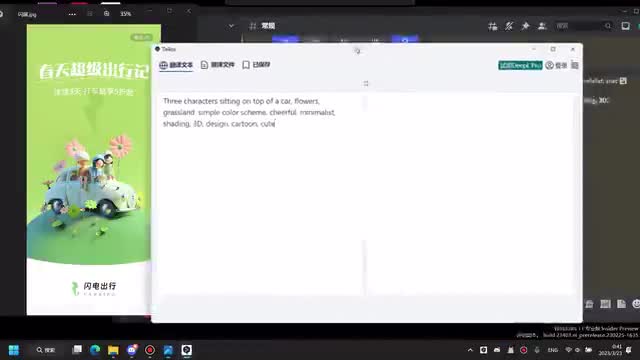 嗯,就是我这边我就是随便写了一些关键词吧,就是我想要有三个人坐在一个车顶上,然后就是一起出去玩的一个感觉嘛,然后有鲜花有草这些东西。嗯,重要的是在这个地方,就是说我希望它是一个三维的一个设计。然后如果你想要那种平面的扁平的,你就输入对应的一个关键词就好了。